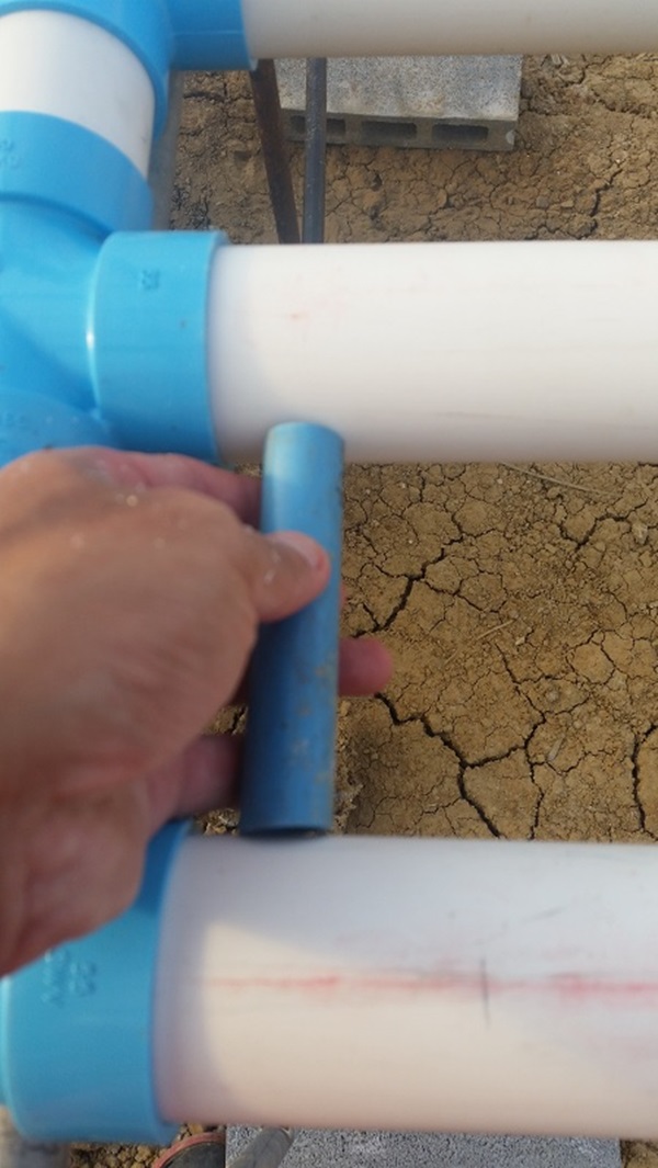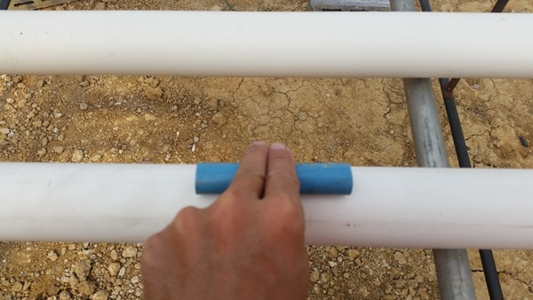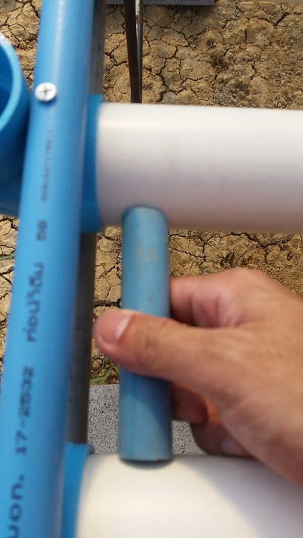 หลังจากนั้นผมก็จะวัดระยะเพื่อสร้างความห่างที่เหมาะสมซึ่งจากการที่ทดลองปลูกมา 2 รอบแล้วก็พอจะบอกได้ว่าระยะที่เหมาะสมระหว่างแถวนั้นจะอยู่ราวๆ 10 -15 CM ครับ ผมก็ตัดเศษท่อเพื่อใช้เป็นตัววัดระยะเพื่อความสะดวกเลยครับ ซึ่งด้านนี้ผมจะใช้ท่อ PVC ขนาด 1/2 นิ้วแล้วยึดด้วยน๊อตเกลียวปล่อยระยะโครงชุดปลูกในฝั่งหัวจะได้ไม่เคลื่อน