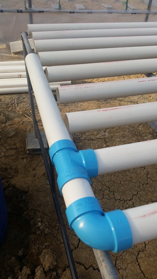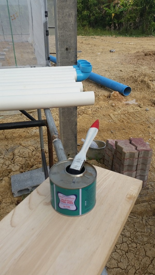 หลังจากนั้นก็ทากาวให้เรียบร้อยครับเพื่อป้องกันน้ำรั่วซึมออกมา จากประสบการณ์ส่วนตัวนั้นแนะนำว่าทากาวมากๆ ครับและก่อนทาควรจะเช็ดฝุ่นออกให้เรียบร้อยด้วย เมื่อทากาวต่อข้องอครบทุกท่อแล้วก็จะได้หน้าตาแบบนี้ครับ