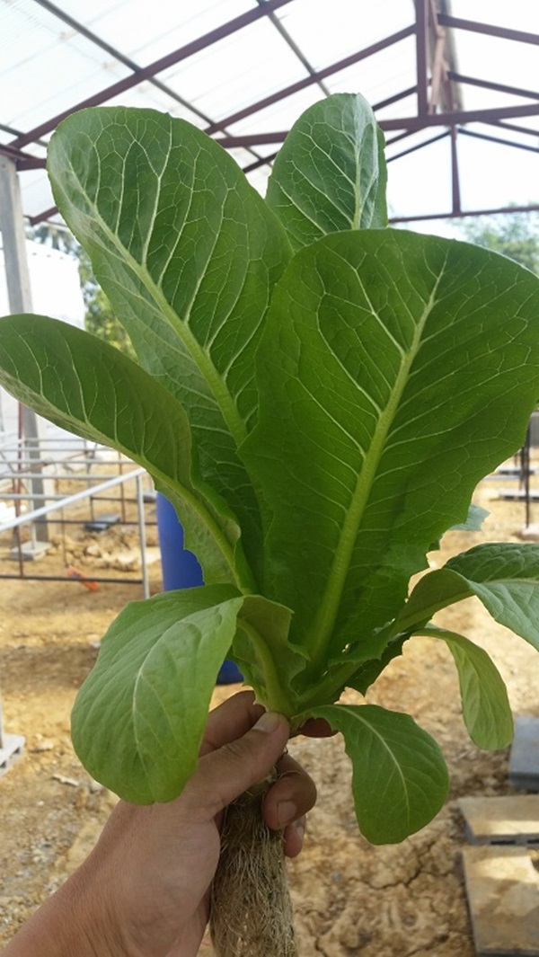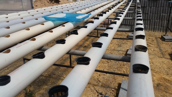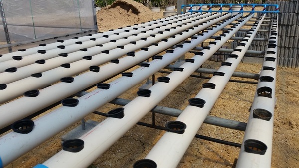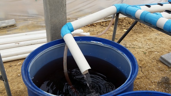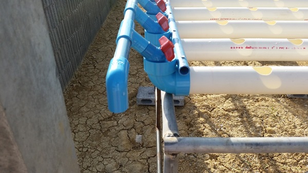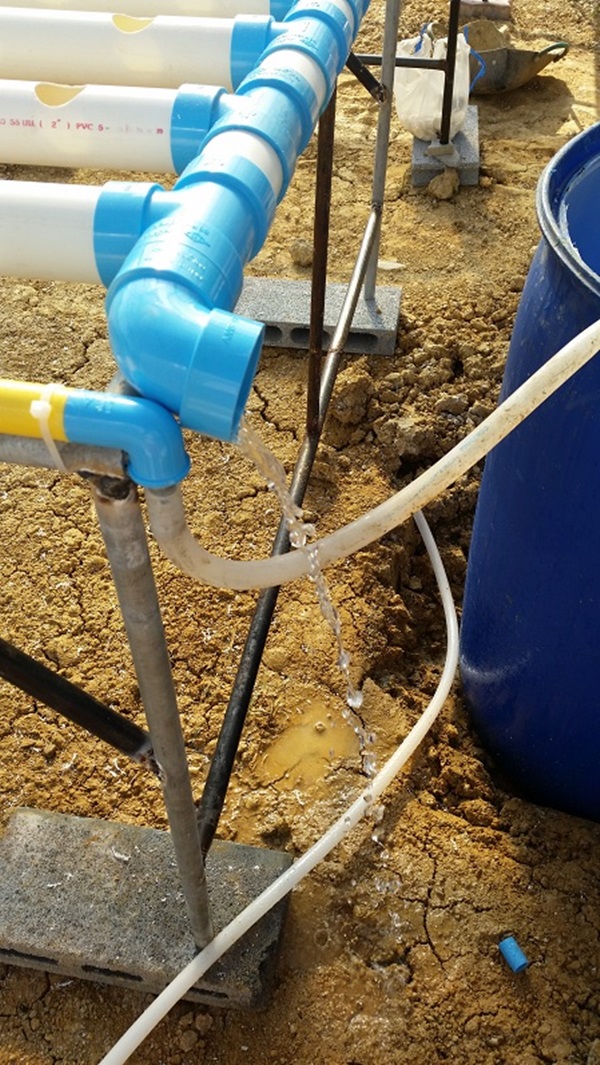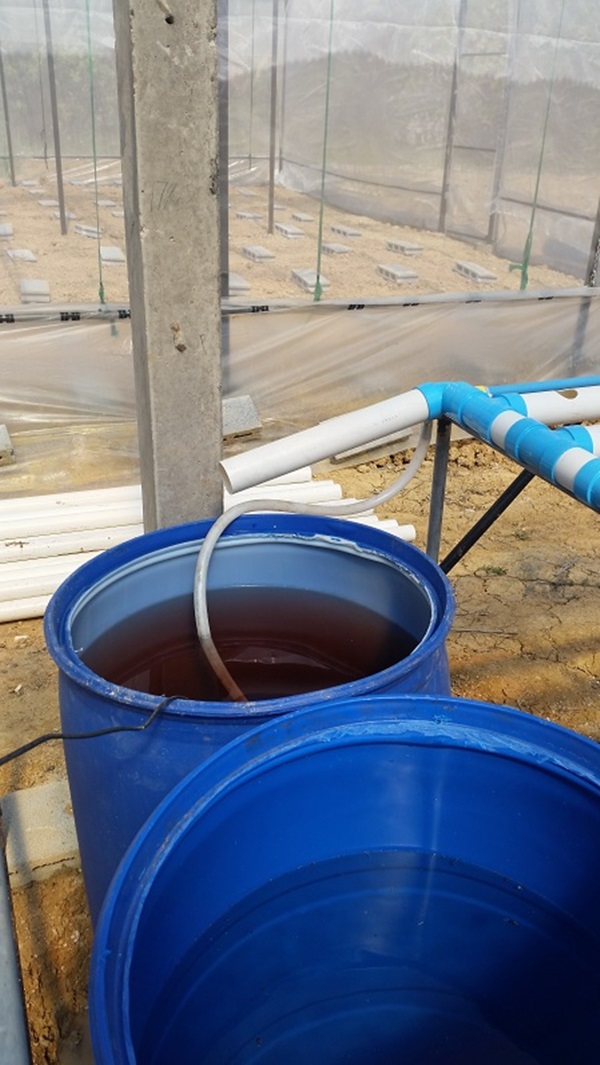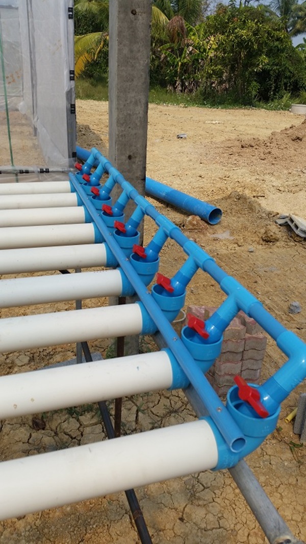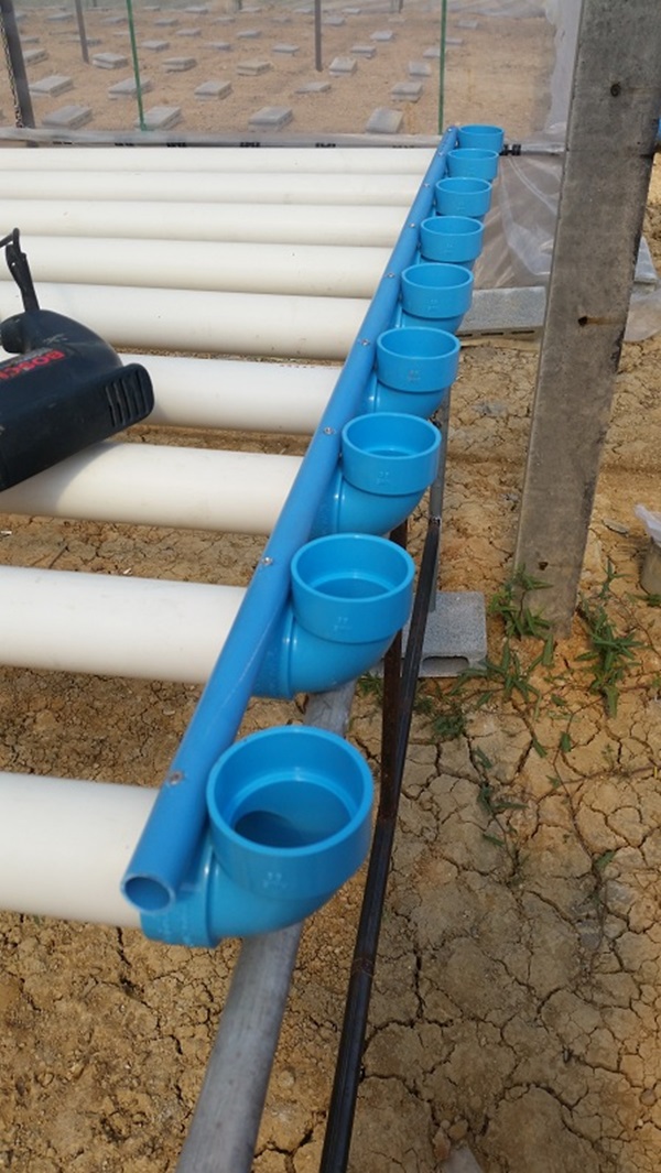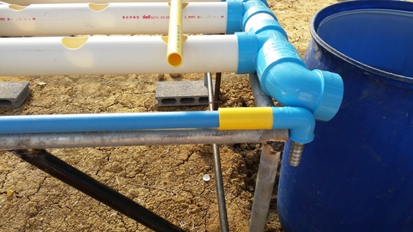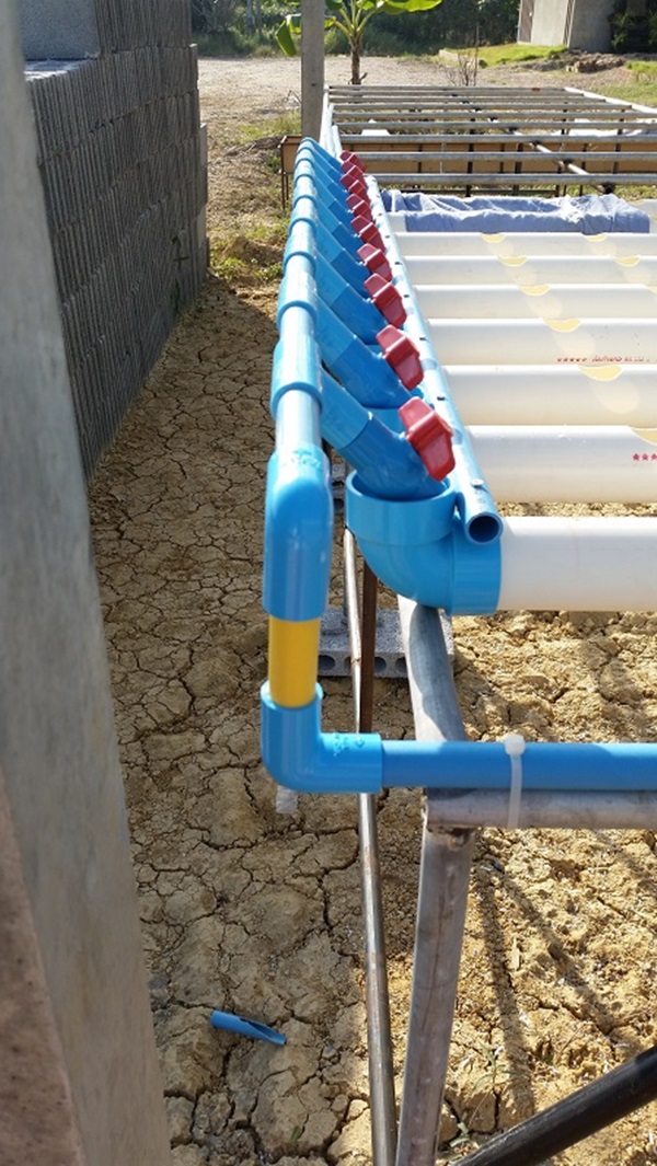 ผมใช้ถังพักน้ำที่เป็นปุ๋ยร่วมกัน 2 ชุดครับ เพราะจากการคำนวณแล้วพบว่าช่วงที่ผักอายุ 35 วันขึ้นไปจะเป็นช่วงที่ใช้น้ำมากที่สุด 250 ต้น ใช้ราวๆ 30 ลิตรต่อวัน ดังนั้นจึงต้องวางถังน้ำไว้ระหว่างสองชุดแบบนี้